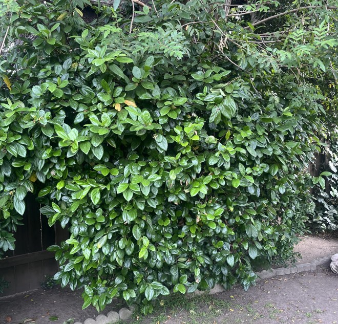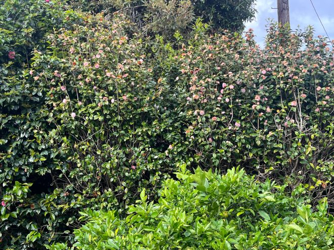 Across the lawn are a couple of camellia bushes, a plant which is native to China and Japan. They form a veritable wall.
