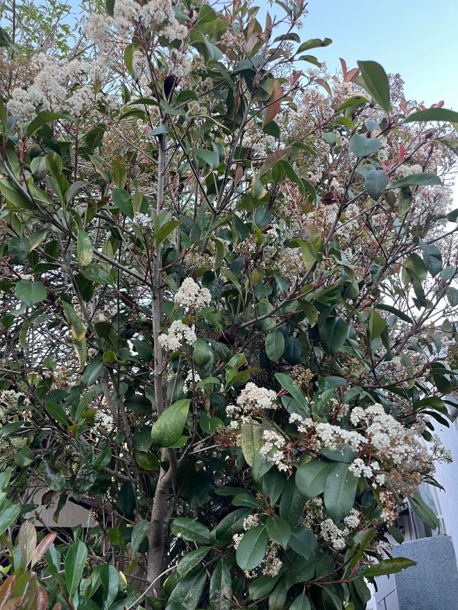 As the photo shows, the top leaves turn bright red. When all the top leaves go red, it is a very handsome sight. This photinia is actually a hybrid, between the Chinese photinia and another photinia, the Japanese photinia, which is not only native to Japan but also to south and central China, as well as to parts of Thailand and Myanmar.