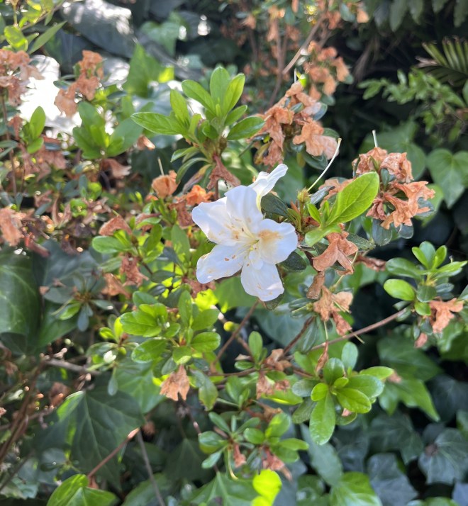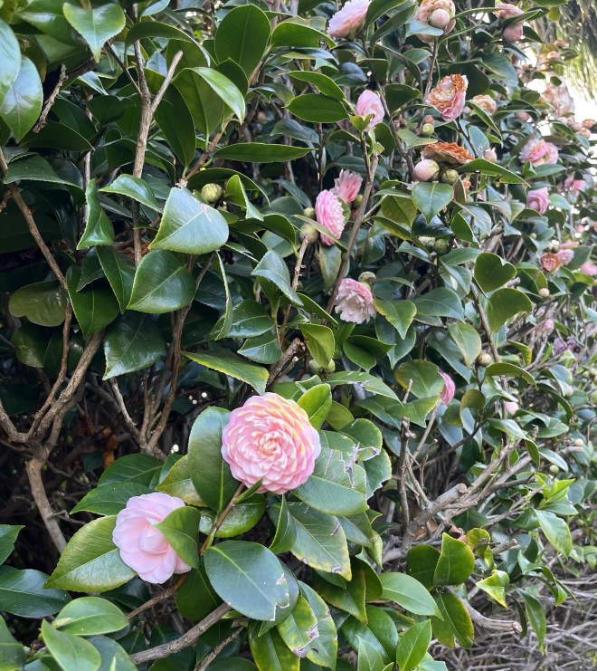 Another camellia down the house’s side alley gently rains white flowers day after day, lifting my spirits as I throw the trash out.