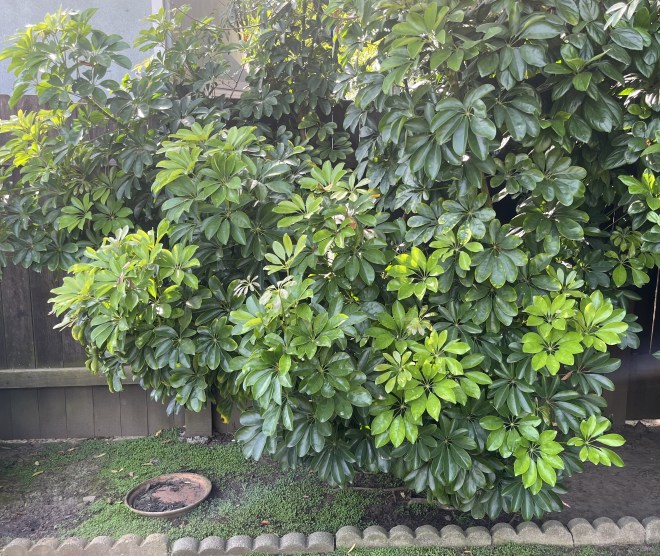 The final immigrant from East Asia is a dwarf umbrella tree. As the name suggests, it is small, pressed down by the other trees and bushes around it.