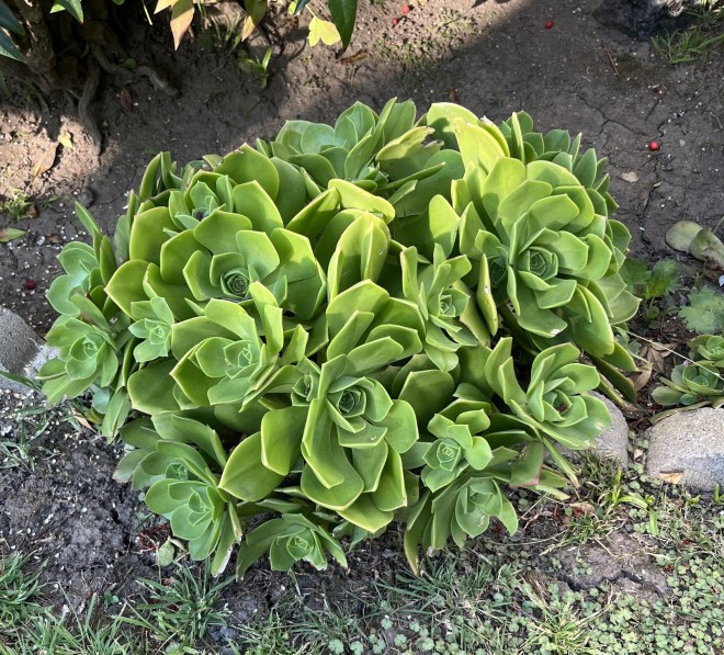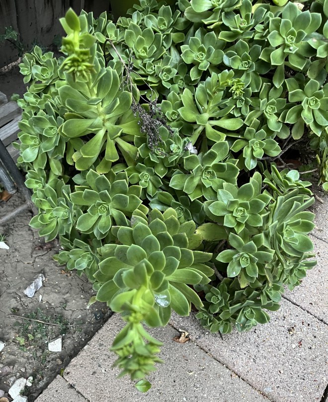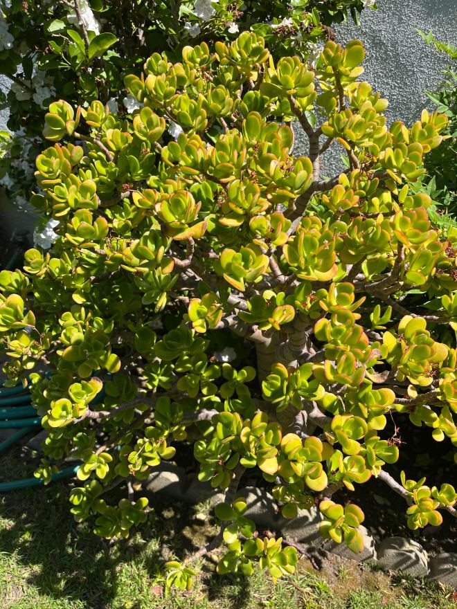 I’m generally not a great fan of succulents, but I have to say, these jade plants are really quite eye-catching. This particular specimen has no flowers at the moment, but another specimen in  another corner of the garden has come out with small pink and white flowers.