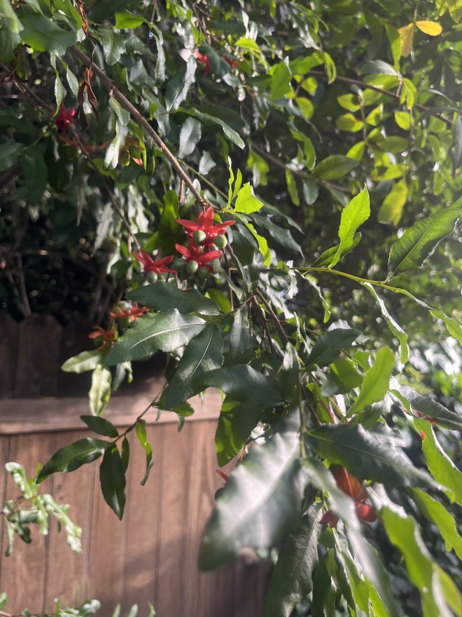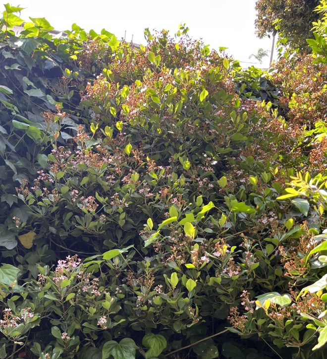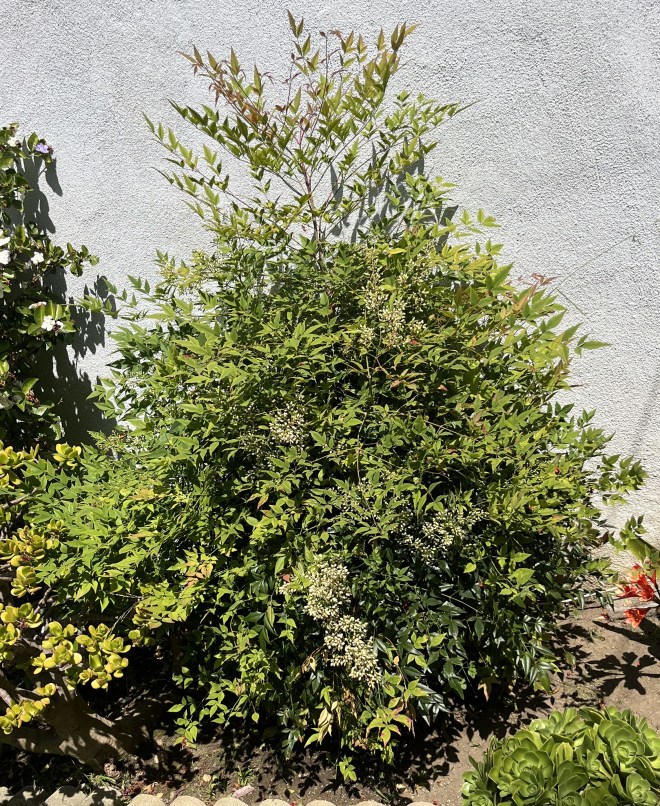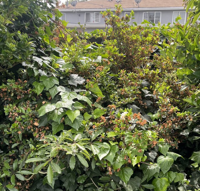The day of the birth is coming soon! Keeping our daughter company as we wait for The Happy Event, we have been spending considerable time in the house’s backyard. It is, I’m sure, like many other backyards in this part of Los Angeles: a rectangle of lawn surrounded by various plants, some introduced by my daughter, some brought in by wind, birds, or squirrels, but the great majority, I’m sure, planted by previous occupants of the house.