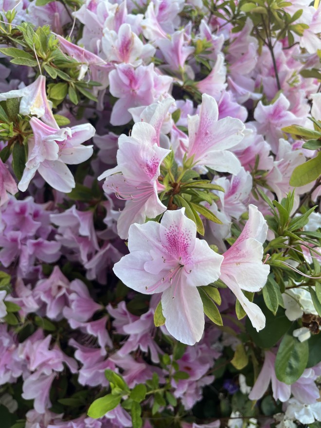 The biggest contributor has been Asia, especially East Asia. The most showy of these Asian immigrants has been an Indian azalea – which, despite its name, is actually native to southern China as well as Viet Nam and Thailand. When my wife and I arrived, we were dazzled by the cloud of flowers on it.