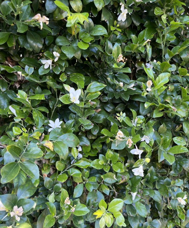 This species of jasmine is native to South Asia, Southeast Asia and northern Australia. The flowers smell lovely, although their density on this particular bush is quite low compared to other species of jasmine my wife and I have seen.