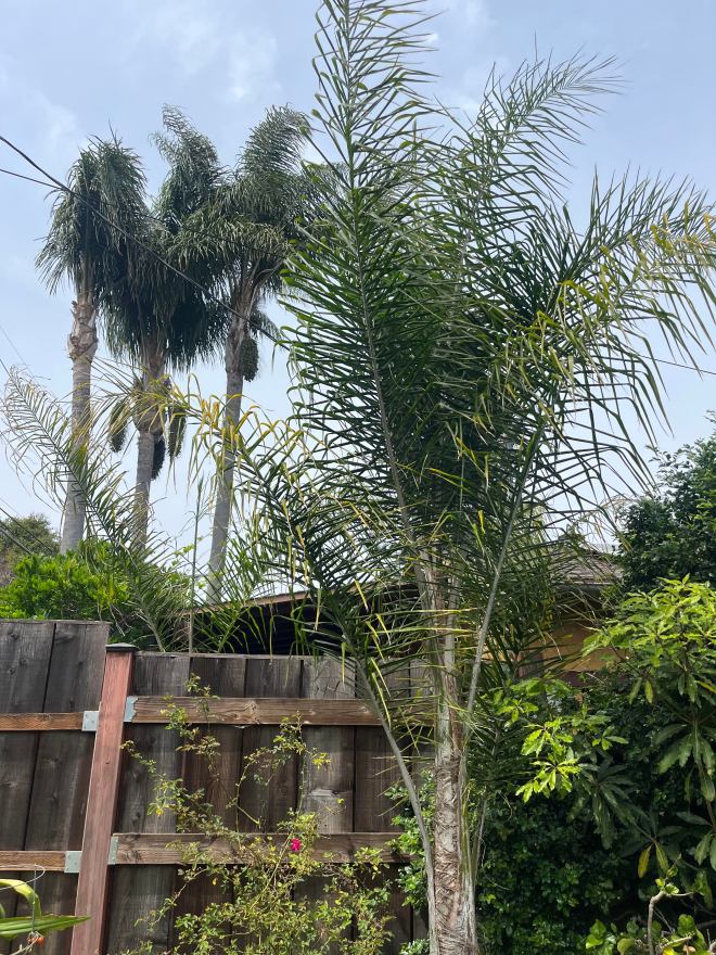 Its original home is the area which is comprised of northern Uruguay, northern Argentina, eastern and central Paraguay, and eastern and southern Brazil. My daughter tells me that this tree just appeared one day. She suspects – correctly, I think – that its parents are the mature queen palms one can see in the background, which grace the neighbour’s backyard. No doubt one of the squirrels which scamper along the garden’s fences brought over a nut which fell from those large, hanging clusters we see on the mature trees.