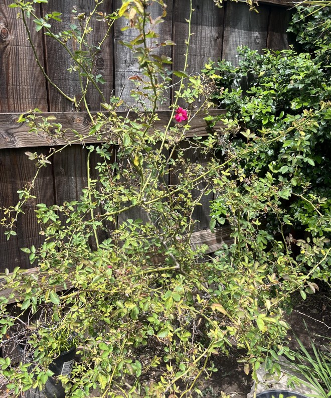 There is also a rose bush against the fence. Truth to tell, as this photo shows, it is a rather miserable specimen, with only one flower on it at the moment.