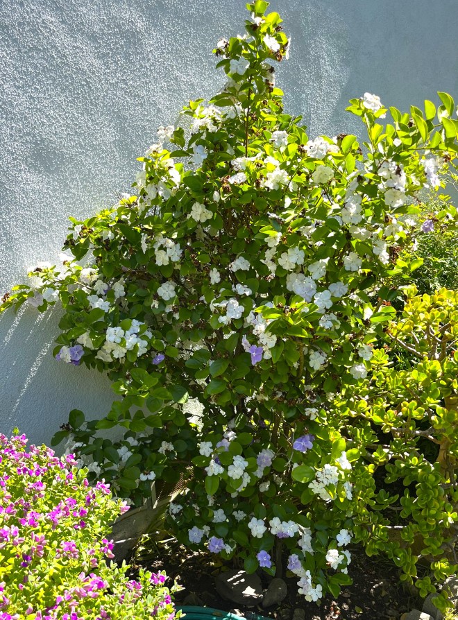 The flowers start as white and then shade off to mauve and finally to purple as they age. I suppose that explains its rather strange name: yesterday, today and tomorrow, as well as a number of variations on that theme of three. It is endemic to Brazil.