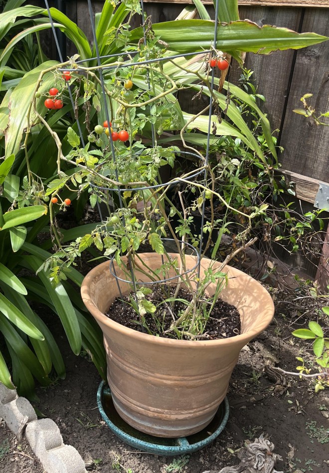 Close to the queen palm my daughter planted a couple of cherry tomatoes last year. I doubted they would take, but one of them has!