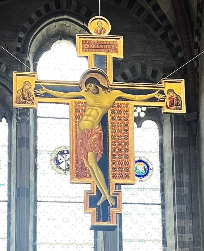In any event, one night Reprobus heard a young voice calling out. It turned out to be a child asking to be carried to the other side. So even though it was late Reprobus put the child on his shoulder, seized his trusty staff, and started crossing. To his consternation, as he waded across, the child got heavier and heavier. So heavy did the child get that this huge, strong man found himself struggling mightily to make it across. When he finally made it to the other side, he said to the child: “You put me in the greatest danger. I don’t think the whole world could have been as heavy on my shoulders as you were.” To which the child replied: “Don’t be surprised, Christopher [which in Greek means Carrier of Christ], you had on your shoulders not only the whole world but Him who made it. I am Christ your king, whom you are serving by this work.” Thus did Reprobus become Christopher. And no wonder Reprobus-about-to-become Christopher is looking so grumpy in that statue in the church in Pupping!