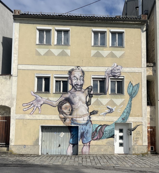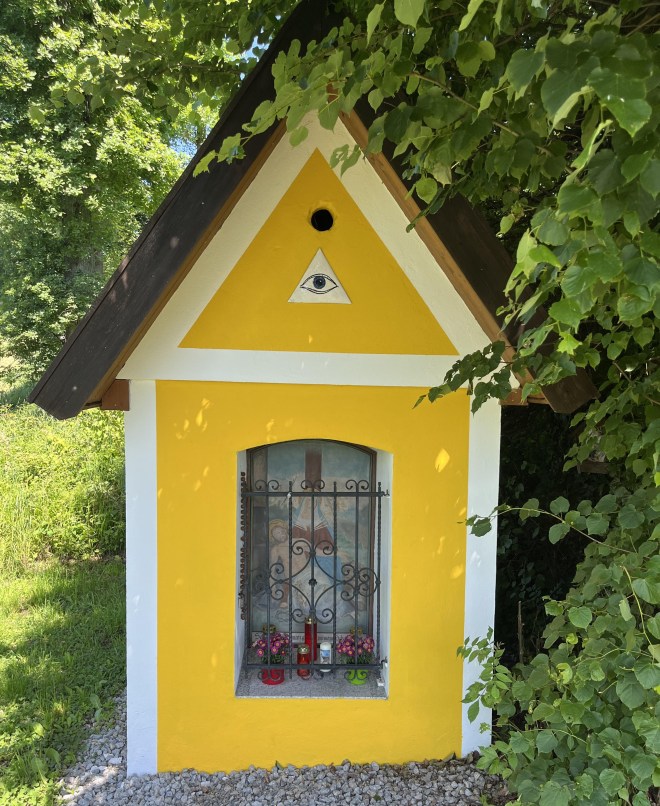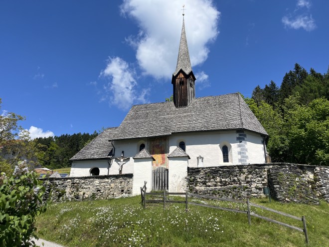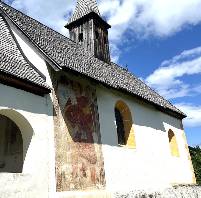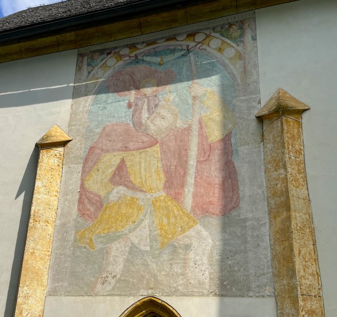 I must confess, the precise theological messages of the story elude me, even though I have perused several posts trying to help me out. In fact, I read elsewhere that the story was actually made up by various churchmen to “normalise” what was a widespread practice by the “little people” of painting enormous portraits of St. Christopher with Christ, first inside their churches and then later on their outer walls. When I read that, I had a jolt of recognition. A couple of weeks before that hike around the Danube, my wife and I had hiked for a couple of days in the south of Austria in the hills around Villach. In some of the small villages we walked through I had noticed these giant St. Christophers painted on the outside of three of the village churches which we passed. I was so struck by them that I took several photos.