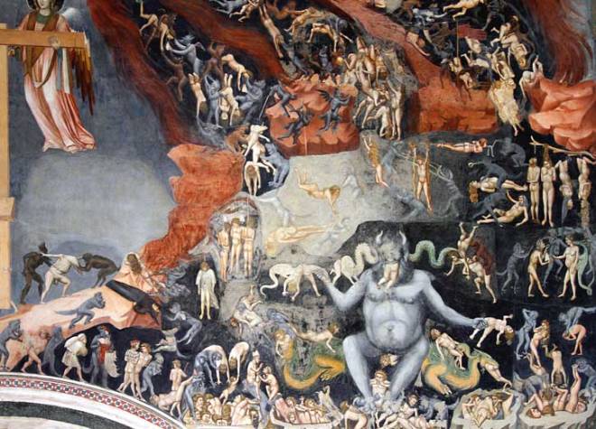 At the time, I had found these frescoes charming. I was now reading that they actually had a precise meaning. They were showing St. Christopher in his role as the “guardian from a bad death”, and especially a sudden and unexpected death. We have to plunge into the Christian mindset of the Middle Ages to understand why this was so vital. Any person who died “unshriven”, that is to say without having confessed and been absolved of their sins, was condemned to spend eternity in Hell without any possibility of salvation. And the torments of Hell were always well represented in church frescoes in case people forgot. Here is one such example, painted by Giotto in the Scrovegni chapel in Padova.
