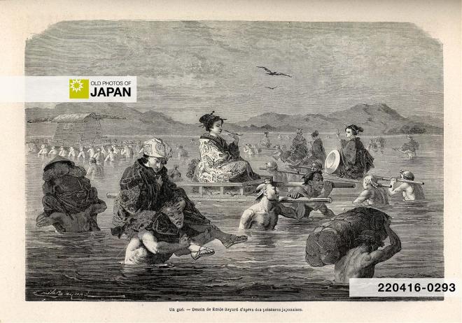 So what is the story that most people have heard about St. Christopher? I think a quick recap might be useful. I should start by noting a little-known fact, that at the beginning of the story our Saint was actually called Reprobus. He was a big, brawny man – a giant in many tellings of his life – and he was in this period of his life spending his time carrying people across a deep ford at a river somewhere in Asia Minor. In case any readers might think this surely was not a job people did in the old days – they would use a boat or a raft, right? – I throw in here a print of people doing precisely this in Japan in the 1860s.