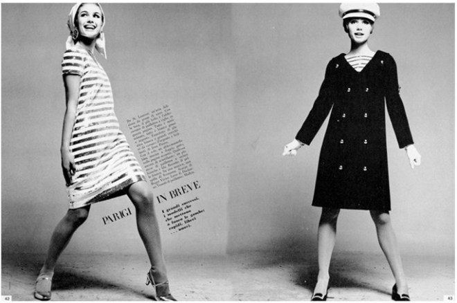High fashion once more picked up on the marinière. Here, we have Yves Saint Laurent’s 1966 take on this item of clothing.