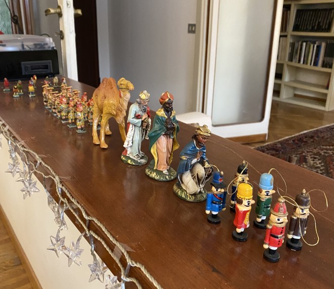 The Three Wise Men are, of course, important characters in our annual crèche. Ever since Christmas Day, they have been travelling across the furniture of our living room, on their way to Bethlehem. This year, I have had them accompanied by a retinue worthy of their rank.