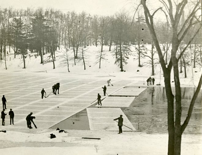 This flourishing ice business came to a crashing halt when artificial refrigeration came along in the early 1900s. The take-over by artificial refrigeration came in stages. Until quite recently, ice was still being delivered to households (I remember my parents receiving their deliveries of ice in the 1960s in West Africa), but now that ice was being made in a centralized refrigeration plant and not in a lake. And then even the local trade in ice disappeared as just about every household eventually owned their own refrigerator.