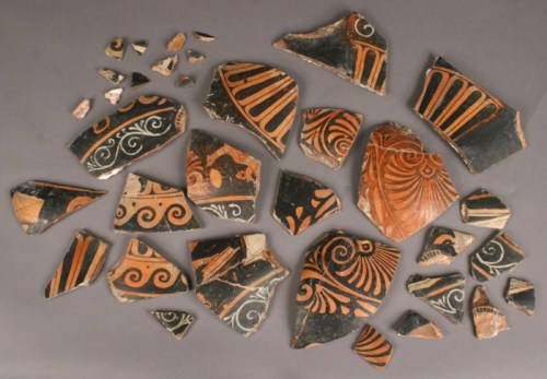Shards of Ancient Greek pottery: https://umfablog.wordpress.com/2011/01/13/collection-highlight-amphora-depicting-shrine-with-warrior-paying-respects-to-deceased-man/