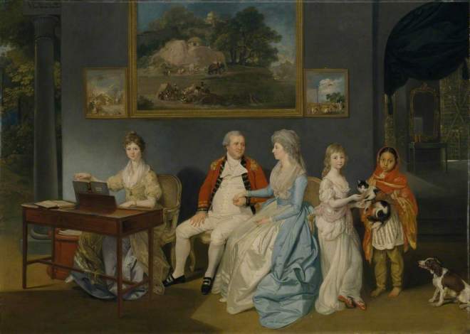 For the sake of completeness, I should say that it wasn’t just black children who were taken on as servants. I’ve already shown one example in the second of the two paintings of Elizabeth Risby. In the Art UK database, there are two other examples of children of other ethnicities being taken on as servants. One is of a certain Colonel Blair and his family. Colonel Blair worked for the East India Company and commanded a brigade at one of the early battles through which the UK eventually took over India.