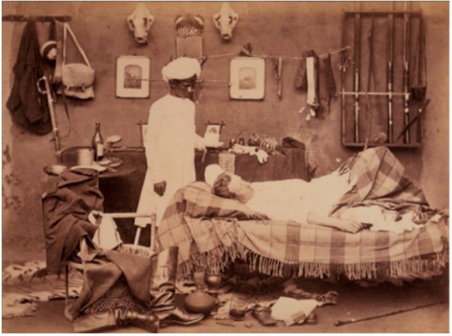 At the beginning, there were few British women in India to feed the men their British meat and potatoes, and since the men did not cook (of course) their diet went native. So far so good. But here I have recourse to another aspect of khichuri, that it is fed to those who are recovering from sickness or are otherwise generally feeble. And so I imagine that the Indian servants fed khichuri to their East India Company masters who had been felled by one of the many diseases of the Indian subcontinent to which their British constitution was not used and against which they had no defence, natural or pharmaceutical. Since the British were very often sick (the death rate among the British at the beginning of their rule in India was alarmingly high), they were very often fed khichuri by their Indian servants (although in this case the servant seems to be bringing his sick master a cup of tea).