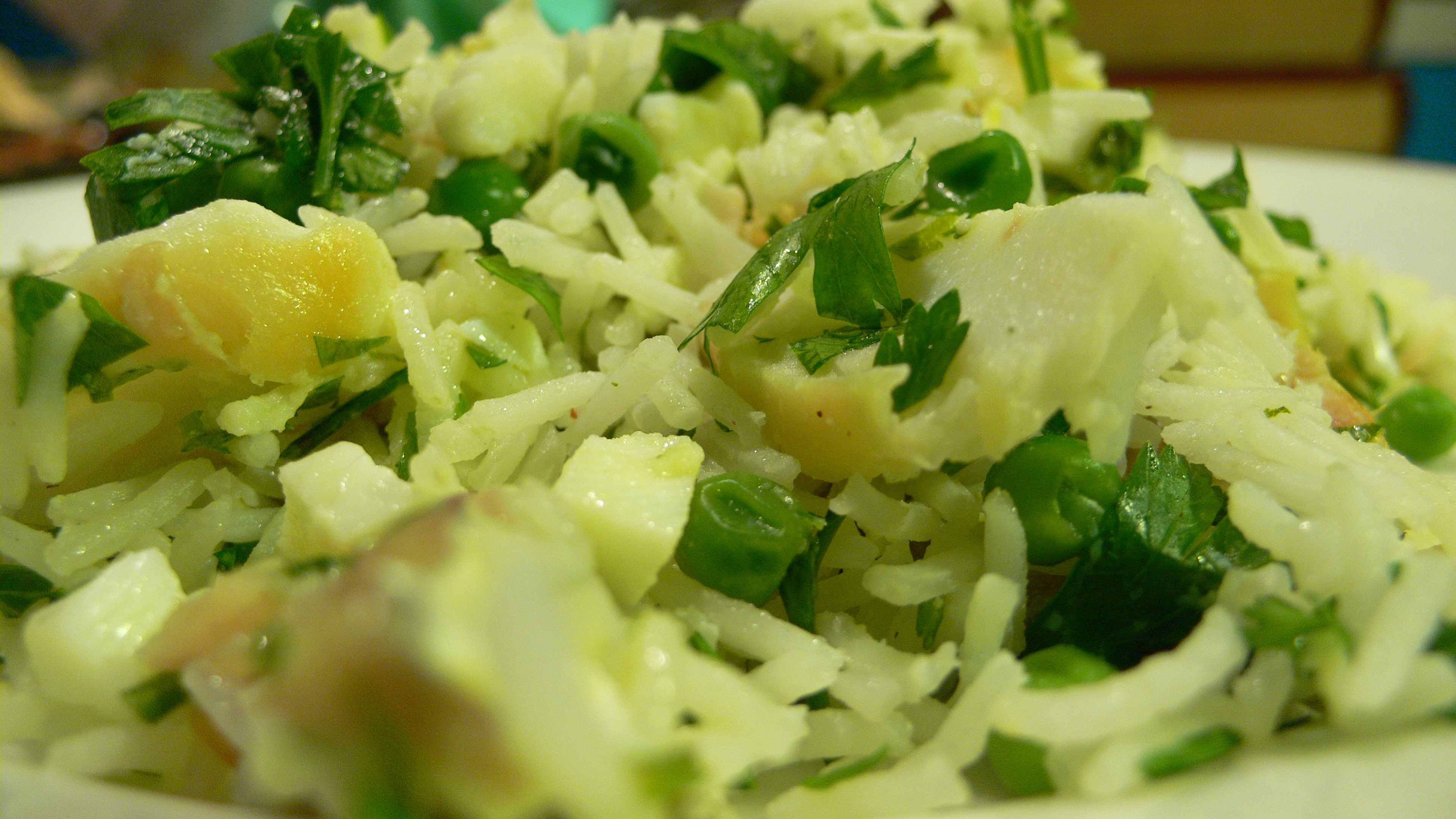 The fascinating thing is to look at the Indian ancestor of kedgeree. The sources all seem to agree on khichdi as the ultimate source, or khichuri to give it what I think is its Bengali pronunciation. A typical recipe goes like this. First, throw out the fish and egg. This seems to have been a British addition (Wikipedia suggests that Bengalis eat their khichuri with fish and/or eggs, but I was able to find no reference to this in other recipes). Second, add lentils to the mix. Because basically, as far as I can make out what we have here is a dal mixed with rice. Third, add vegetables like cauliflower and peas. Cook the lentils, the rice, and the vegetable in the sauce, et voilà! (more or less; I’m cutting details).