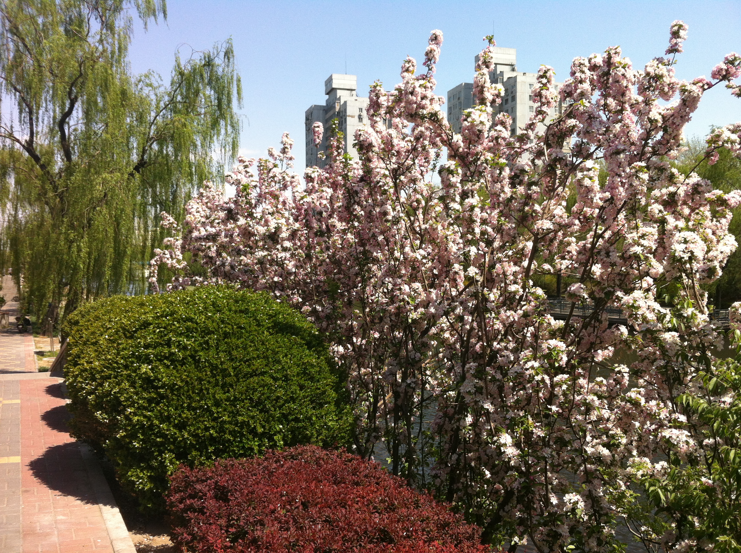 After a long, cold gestation, spring has finally arrived with a bang in Beijing. Suddenly, every tree, every bush, every plant is thrusting eagerly out to the sun and warmth. The Beijing authorities have been good enough to plant many flowering plants along and around my piece of canal, so my daily walks to and from the office are currently accompanied by a riot of colour.